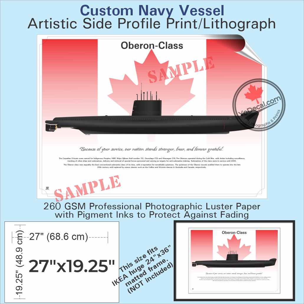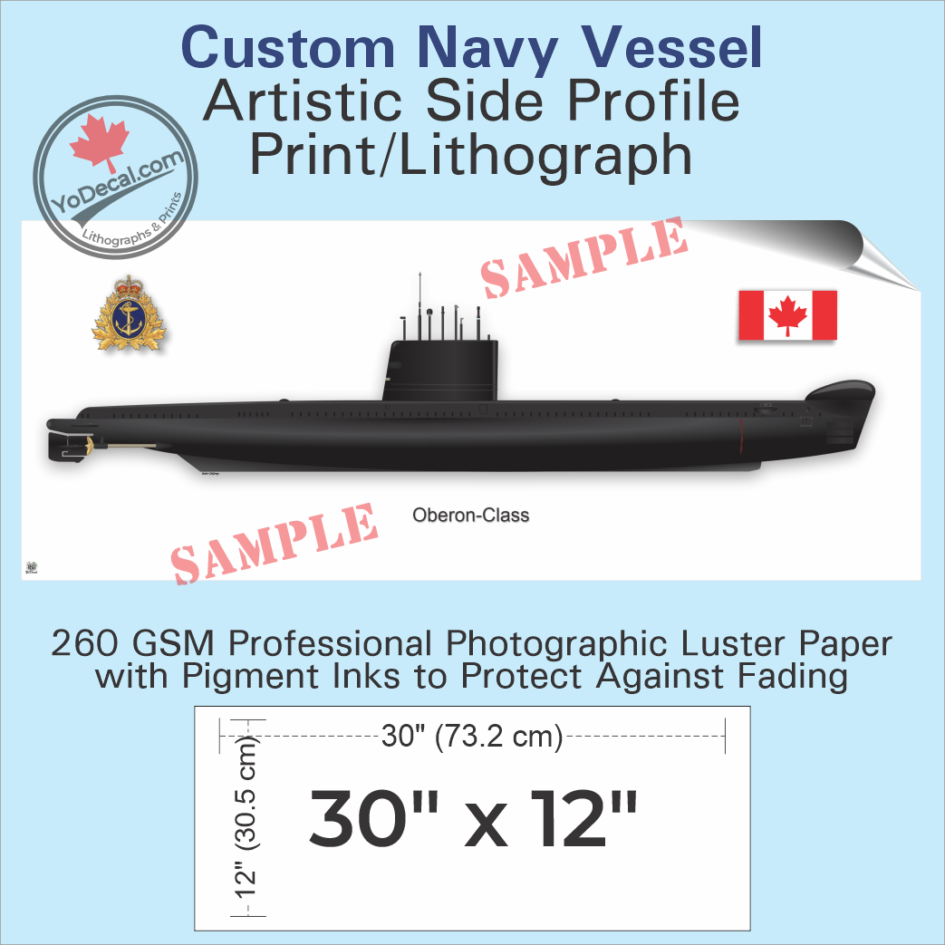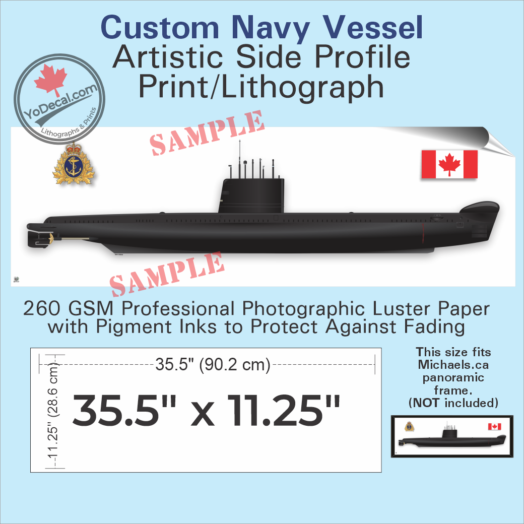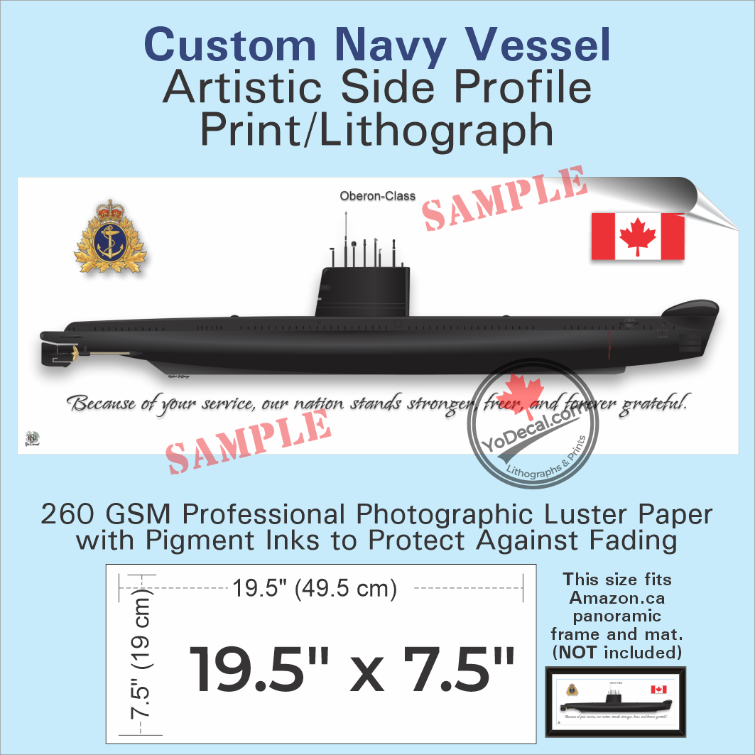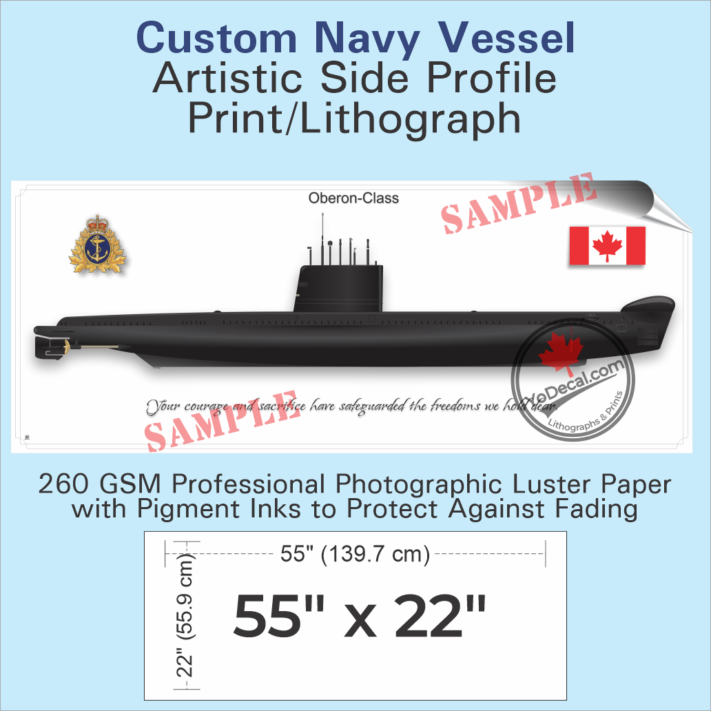 Custom Navy Vessel Side Profile Art Print / Lithograph - (frames not included) depicting your choice of Navy, Coast Guard or commercial vessel! Beautifully detailed custom item and custom crests / items on backdrop in various print sizes with certain sizes matched up with easily available frame sizes as indicated in the images. Your side-profile art print created by Canadian veteran & graphic artist Robert St.George. Wonderful for gifts and special occasions where a thoughtful item and quality are a must. Each piece is signed by the artist.