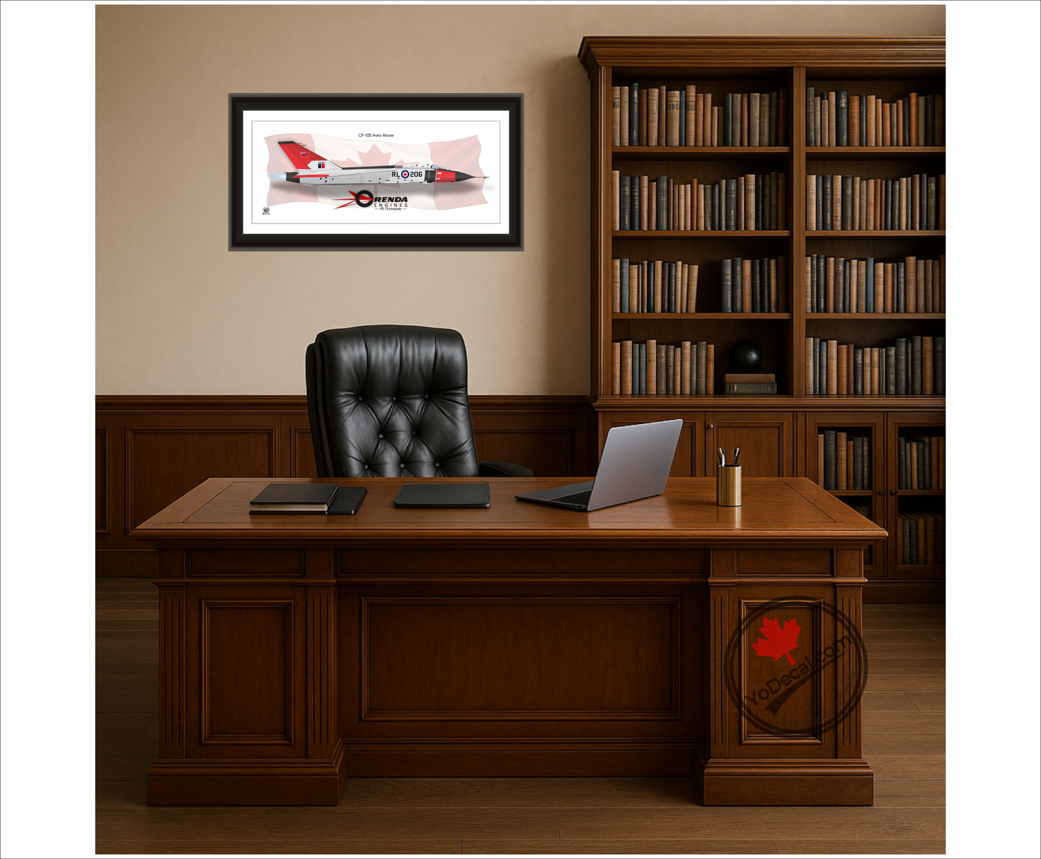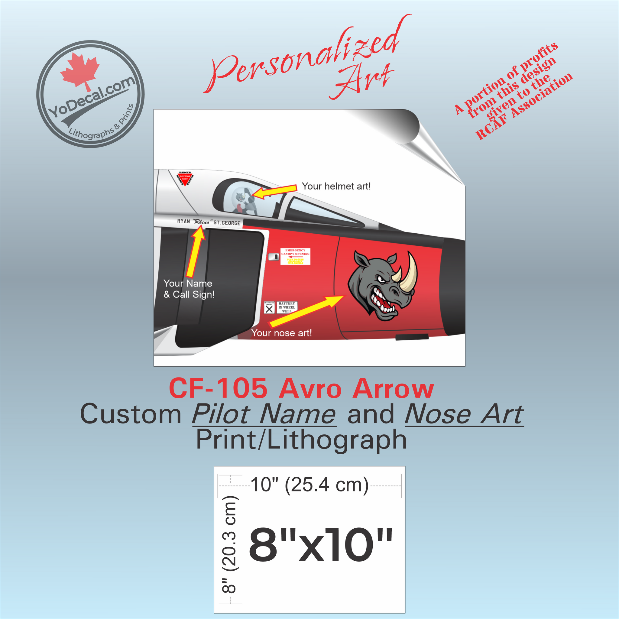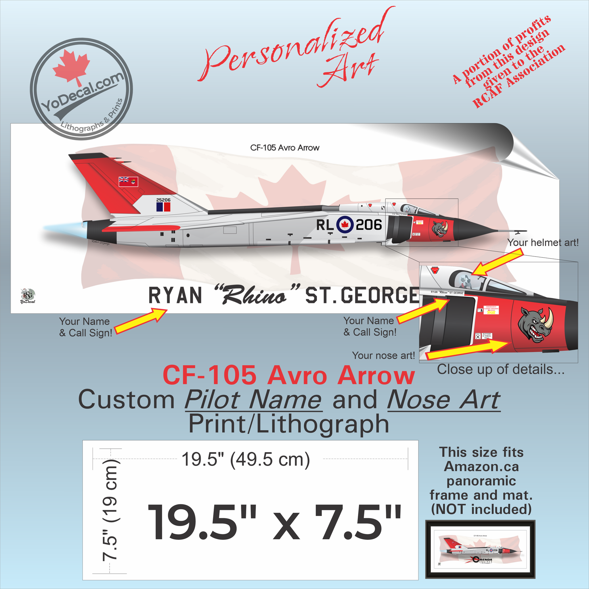 Lithographie personnalisée du profil latéral du CF-105 Avro Arrow - (cadre non inclus) représentant le célèbre avion canadien CF-105 Avro Arrow, avec votre nom, votre indicatif d'appel et un motif pour le nez/casque de l'appareil!