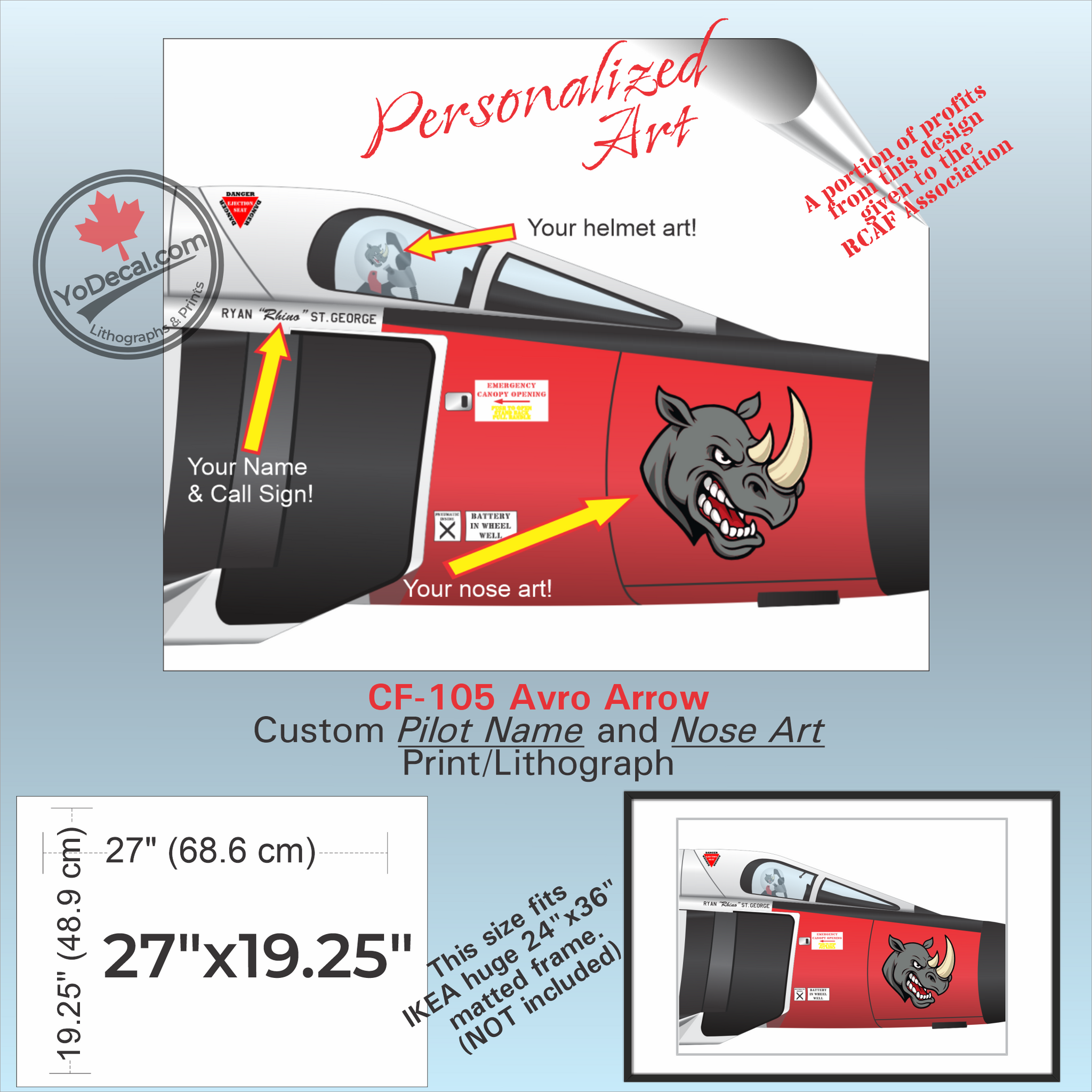CF-105 Avro Arrow PERSONALIZED Aircraft Side Profile Art print / lithograph - (frames not included) depicting the world-famous Canadian CF-105 Avro Arrow and your name, call sign and nose/helmet art!