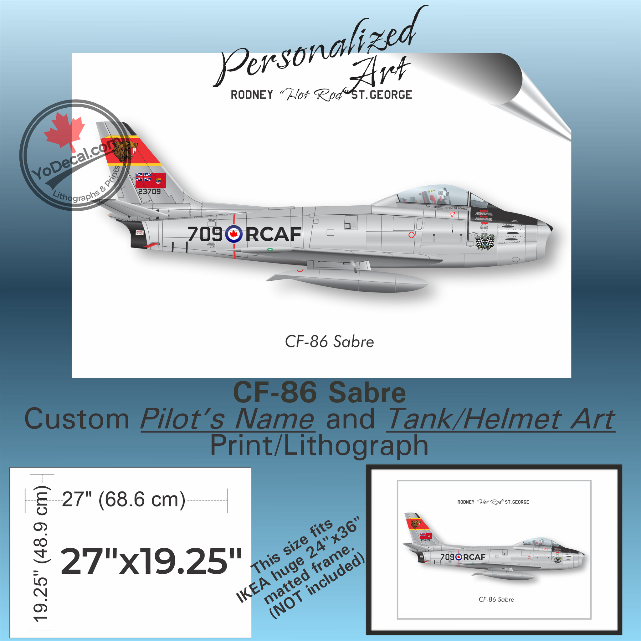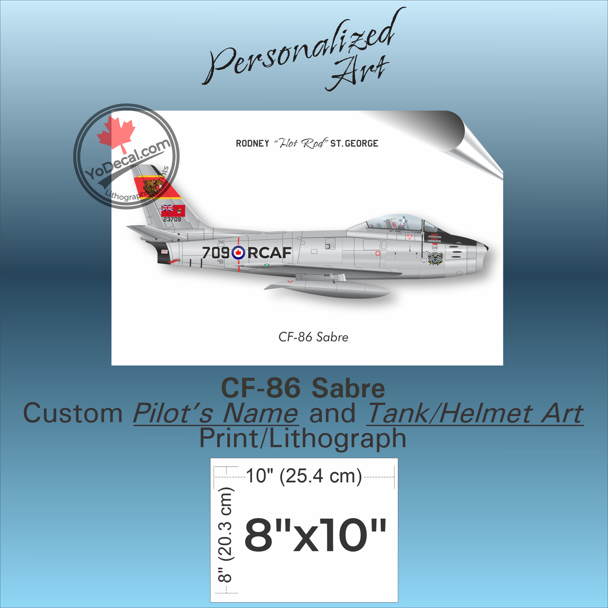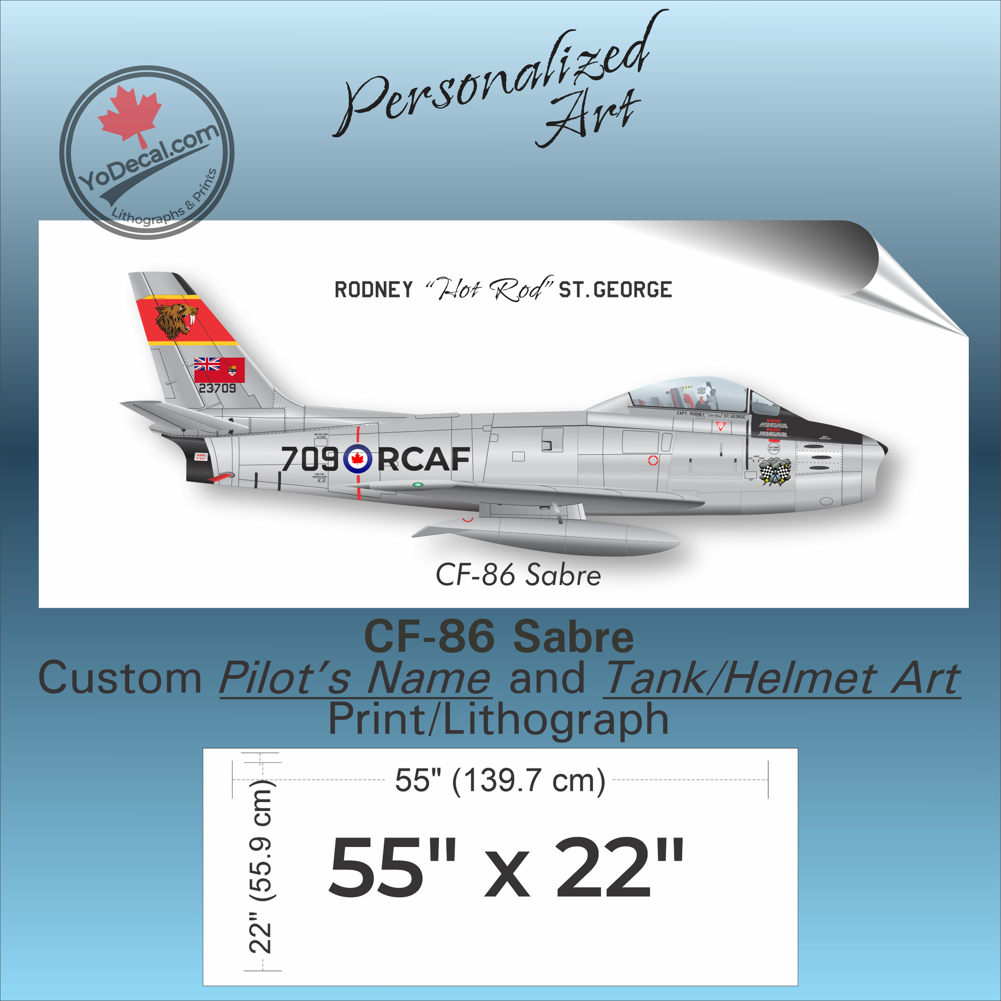 CF-86 Sabre PERSONALIZED Aircraft Side Profile Art print / lithograph - (frames not included) depicting the cold war Canadian CF-86 Sabre by Canadair and your name, call sign and nose/helmet art! A portion of the profits from each of this plane's prints is given to the RCAF Association!