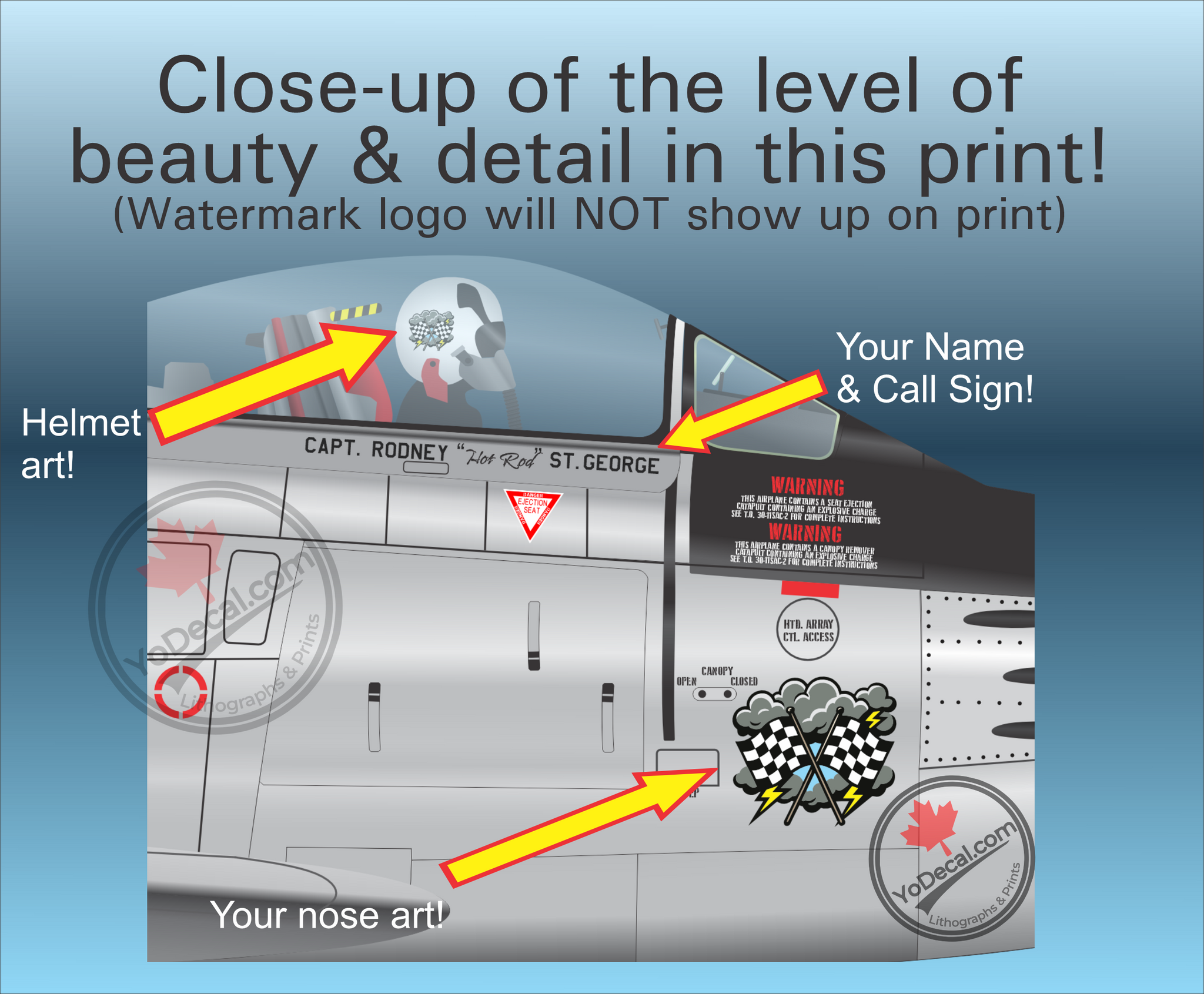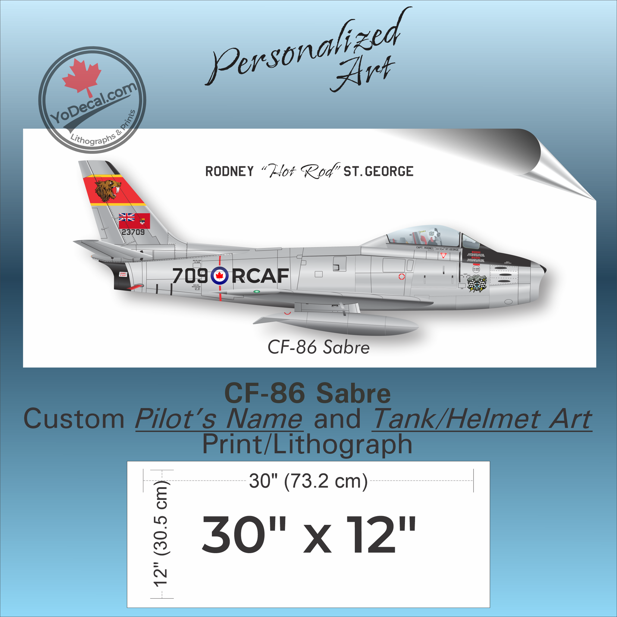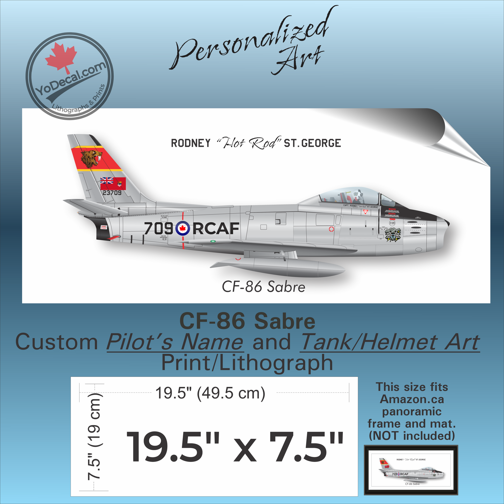 CF-86 Sabre PERSONALIZED Aircraft Side Profile Art print / lithograph - (frames not included) depicting the cold war Canadian CF-86 Sabre by Canadair and your name, call sign and nose/helmet art! A portion of the profits from each of this plane's prints is given to the RCAF Association!